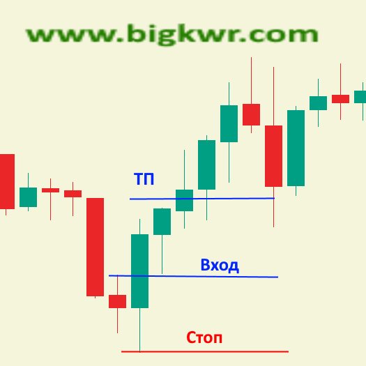 Перевіряти можливість входу на ринок треба із закриття денної свічки. Сигналом до входу в угоду буде зміна кольору свічки по відношенню до попереднього дня, тобто зміна напрямку руху. В цьому випадку вхід в ринок буде здійснюватися відкладеним ордером на третій свічці: Buy Stop, якщо ведмежа свічка змінилася на бичачу, і Sell Stop, якщо бичача змінилася на ведмежу. При цьому ордер виставляється на відстані декількох пунктів вище/нижче точки High/Low свічки, що закрилася.